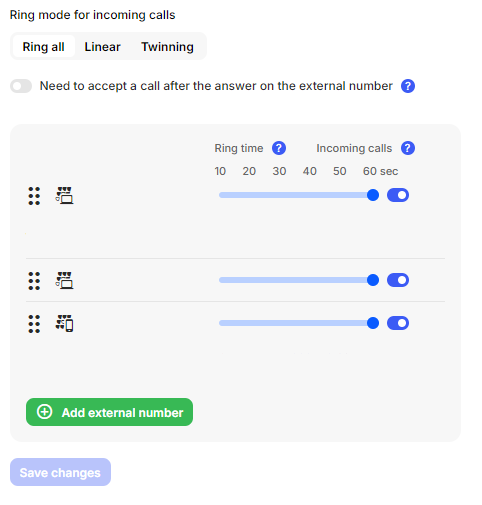 If a User has multiple devices, they can set the ring mode, turn a device on or off, and rearrange the ringing order in a linear ring mode.